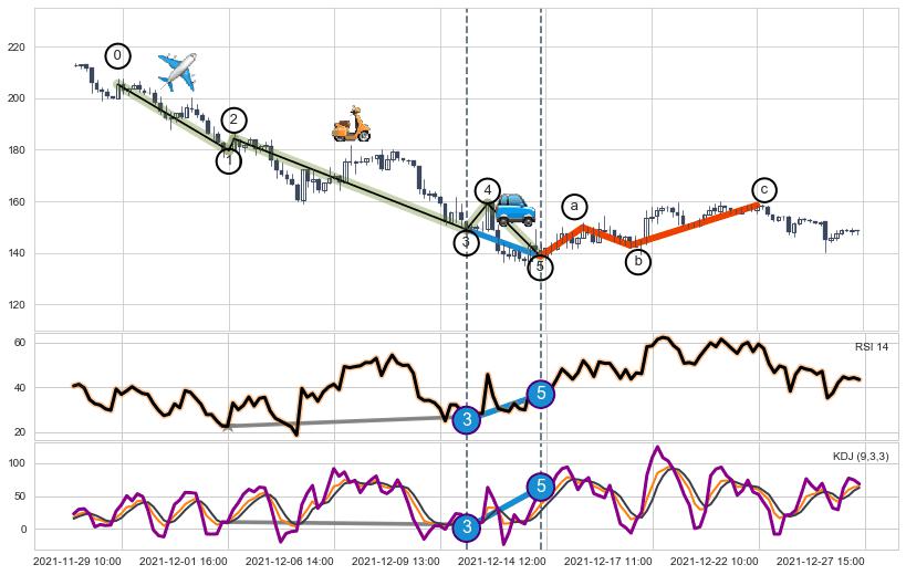 ➣ 波浪理论:猜想达到c点后小反弹终止反转下跌 → 下跌 → 【拐点】临近 → 阶段均值回复结束后继续大周期趋势跟踪