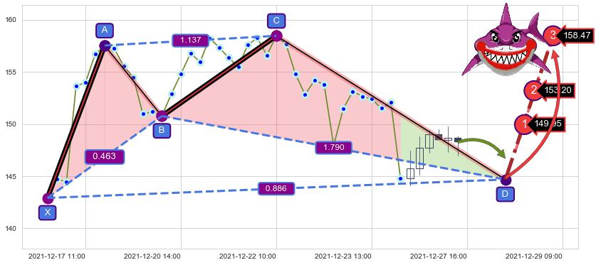 ➢ 谐波鲨鱼:c下跌临近d:猜想拉升 → 上涨 →【拐点】强支撑临近 → 大趋势均值回复