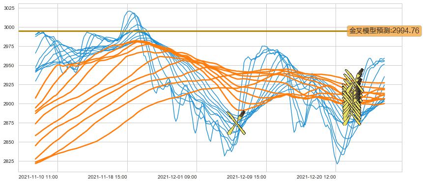 ➢ 55小时均线于(12-21 16:00: 2886.60)形成【金叉】基于【金叉历史模型】预测金叉后最高波峰价格: 2940.21, 金叉后最高价格2964.83,已经上涨超出预测最高波峰价格, 预期回调