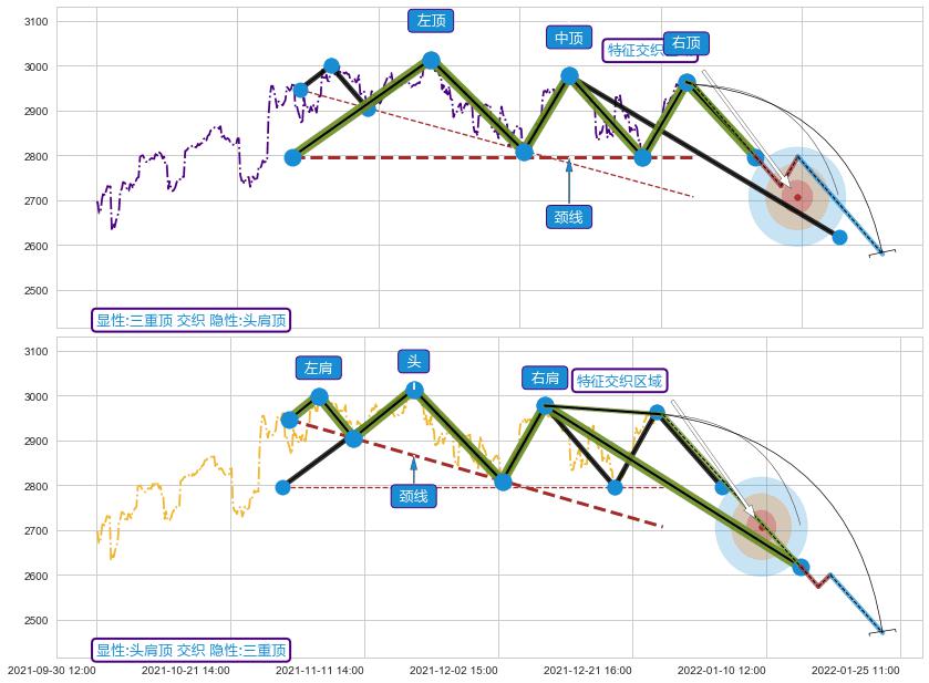 ➣ 头肩顶:猜想临近关键支撑位突破点 → 临近拐点下跌 → 风险信号 → 大趋势均值回复