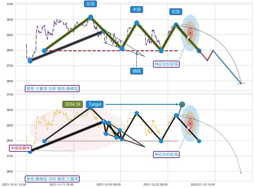 ➢ 降楔型属【中级别信号事件】三重顶属【长级别信号事件】中长周期组合信号事件,中长事件长度比64.44%