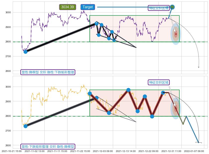 ➣ 下跌矩形整理:猜想临近关键支撑位突破点 → 临近拐点下跌 → 风险信号 → 大趋势均值回复