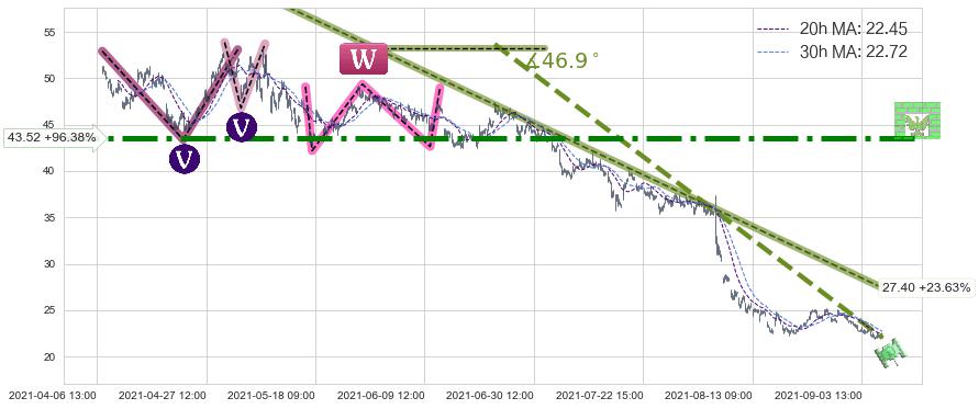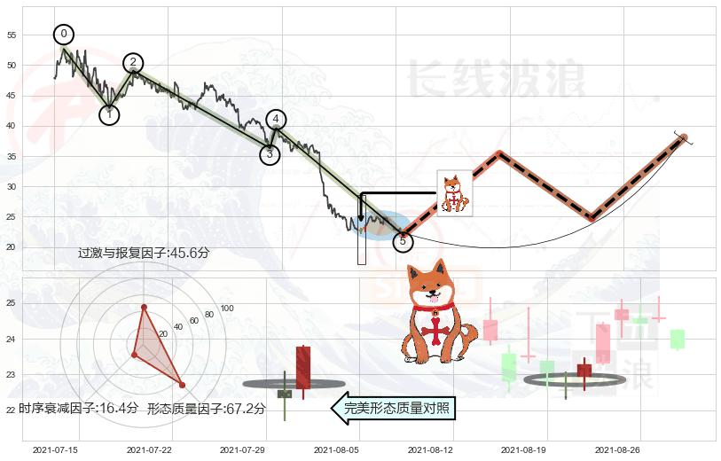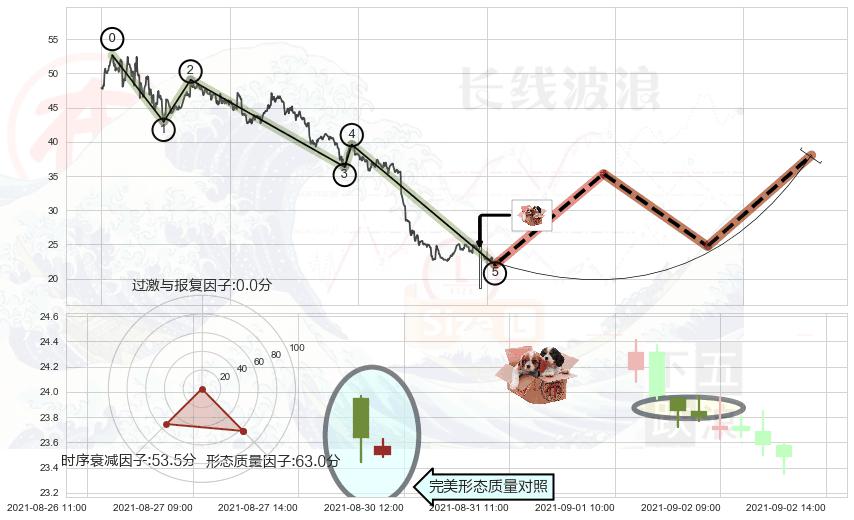 从2021-04-29 14:00至2021-09-09 14:00,共包含604个小时,阶段股价下跌-80.48%,阶段股价变动位移路程比: 1 : 6,下跌趋势角度: 46.9