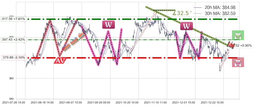 ♘ 阻力价格位397.43,可信任强度50.15%,距离最后交易2021-12-27 15:00形成的收盘价格388.03相差 +2.42%