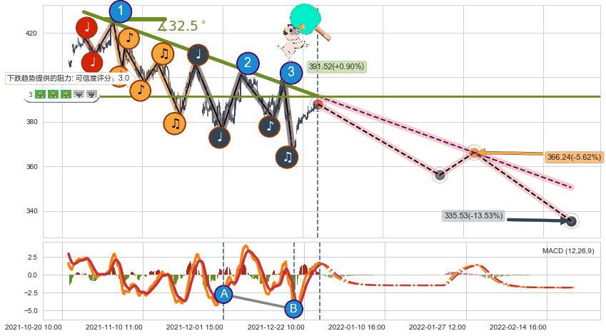 ♘ 在最后的下跌阶段2021-10-26 10:00至2021-12-27 14:00,存在 持续未破位的阻力位 ,阻力价格391.52,可信任强度75.55%,其距离最后价格388.03相差 +0.90%