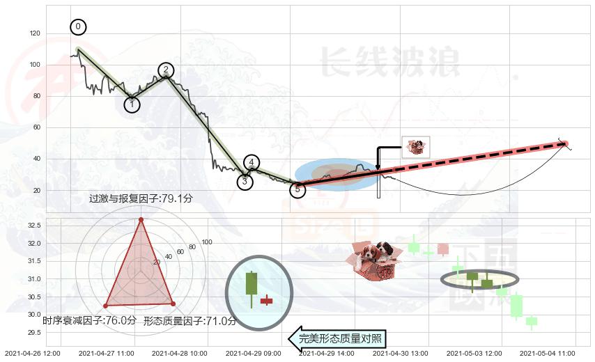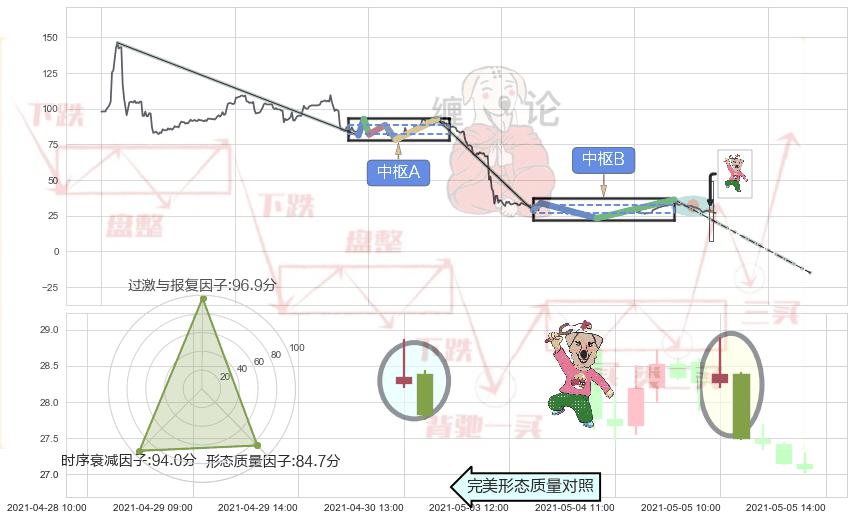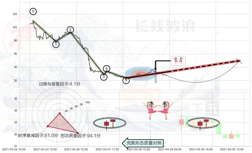 ➢ 🕰 价格走势在2021-04-27 12:00:00至2021-04-27 13:00:00期间形成顶部尽头线(下山虎),残存影响值:-2.41