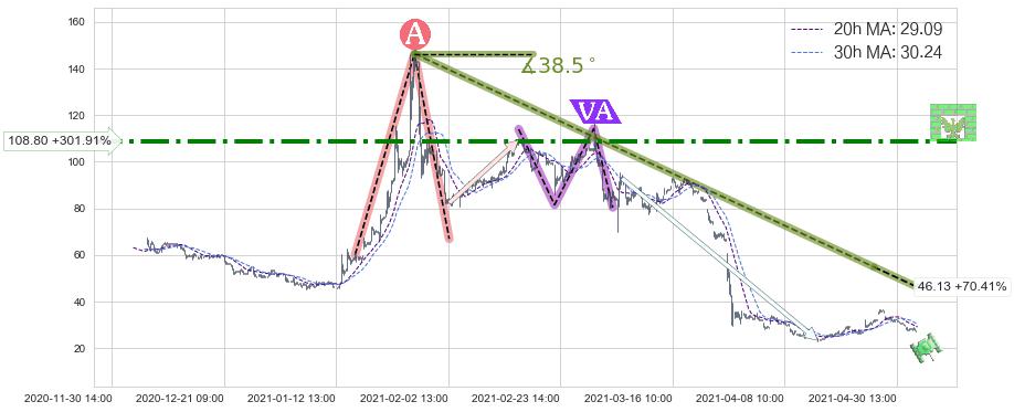 ♘ 在最后的下跌阶段2021-01-27 13:00至2021-04-27 11:00,存在 持续未破位的阻力位 ,阻力价格46.13,可信任强度78.66%,其距离最后价格27.07相差 +70.41%