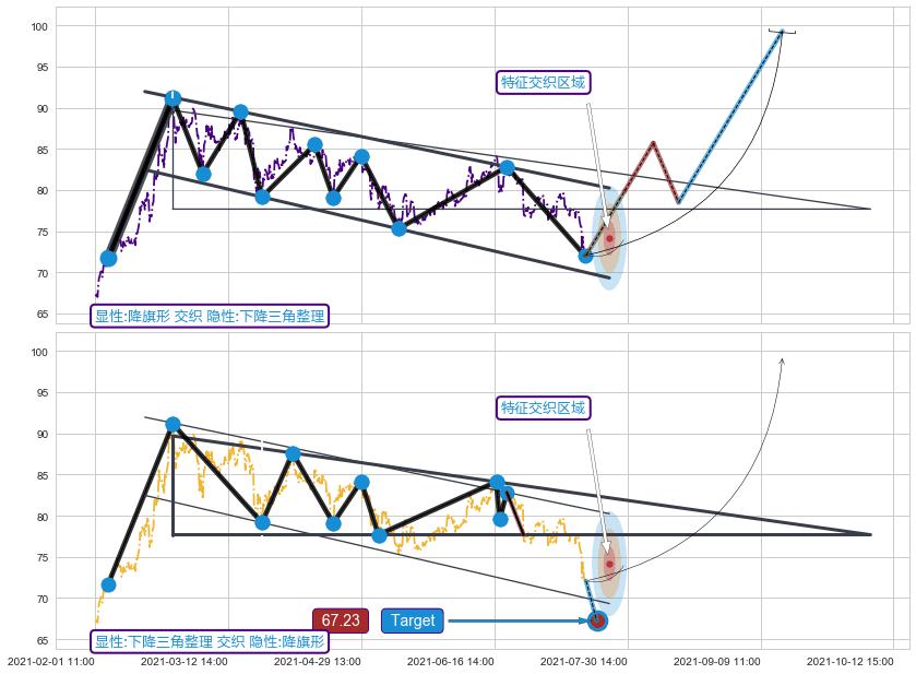 ➢ 下降三角整理:猜想预期下跌目标target即将达成,随后猜想强支撑来临,预期反弹上涨(均值回复)