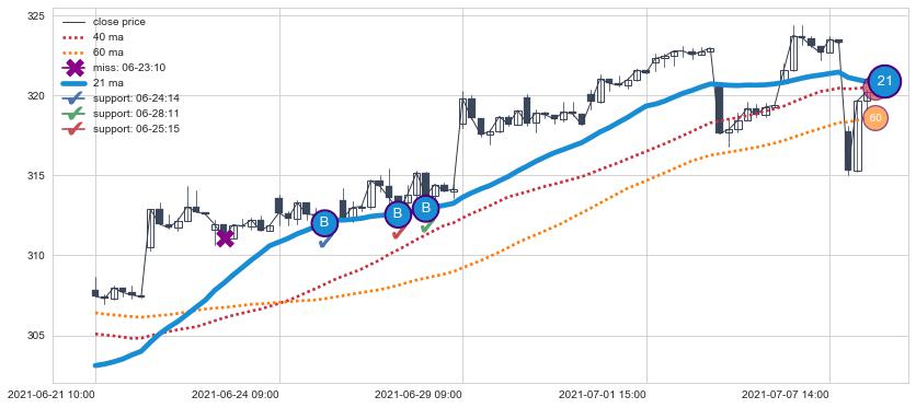 ➢ 最优均线组合共正确确认支撑阻力信号7处,正确确认率 50.00%