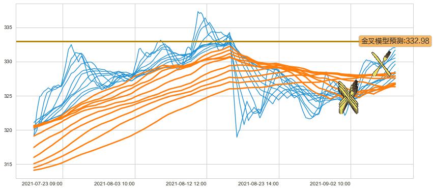 ➢ 13小时均线于(09-08 11:00: 329.58)形成【金叉】基于【金叉历史模型】预测金叉后最高波峰价格: 342.11, 金叉后最高价格332.54,尚未达到预测最高波峰价格, 预期继续上涨