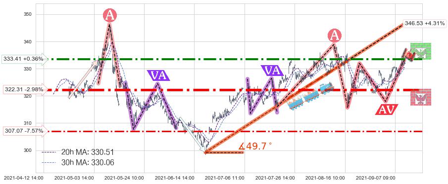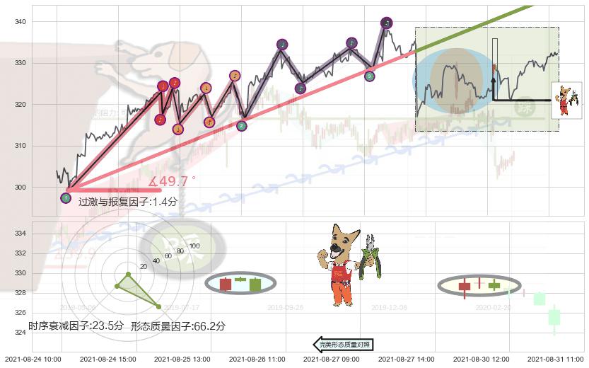 ➣ 2021-06-18 09:00-2021-08-16 14:00上升趋势存在反转[风险],其原上升趋势的支撑位(346.53)已破位[强阻力信号],原上升趋势角度: 49.7˚