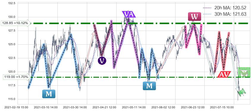 ♘ 阻力价格位119.00,可信任强度64.69%,距离最后交易2021-07-19 15:00形成的收盘价格117.01相差 +1.70%