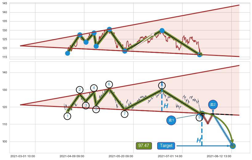 ➣ 扩散三角反转:猜想临近关键支撑位突破点 → 临近拐点下跌 → 风险信号 → 大趋势均值回复