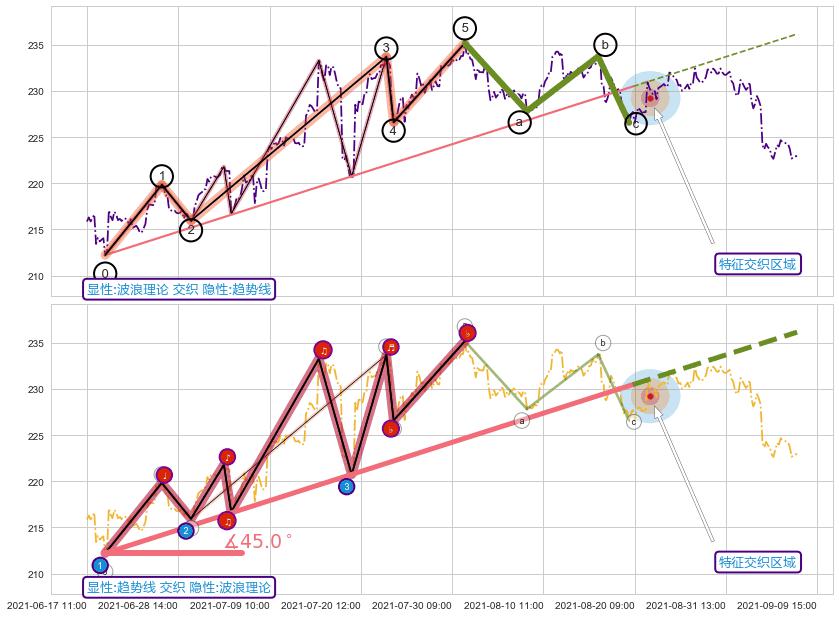 ➢ 波浪理论与趋势线信号事件周期长度级别相同,同周期信号事件