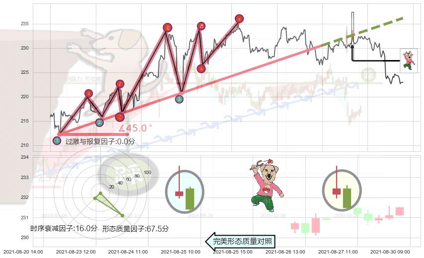 ➢ 2021-06-18 14:00-2021-08-19 14:00上升趋势存在反转[风险],其原上升趋势的支撑位(236.17)已破位[强阻力信号],原上升趋势角度: 45.0˚