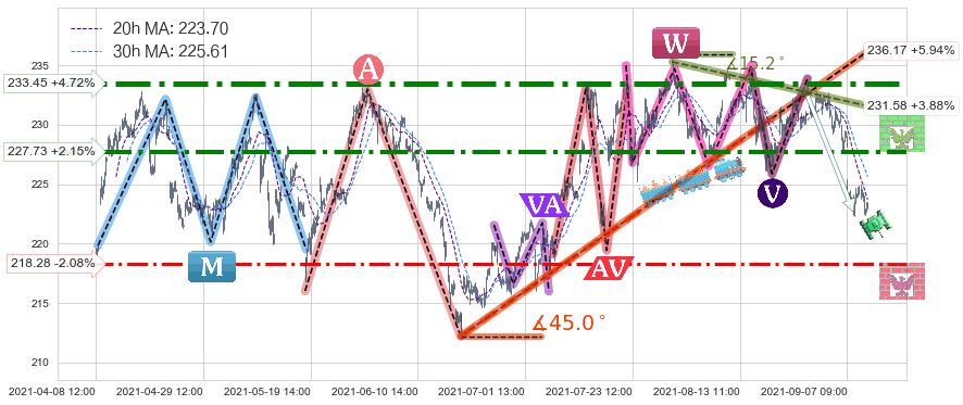 ♘ 阻力价格位233.45,可信任强度99.00%,距离最后交易2021-09-09 15:00形成的收盘价格222.93相差 +4.72%