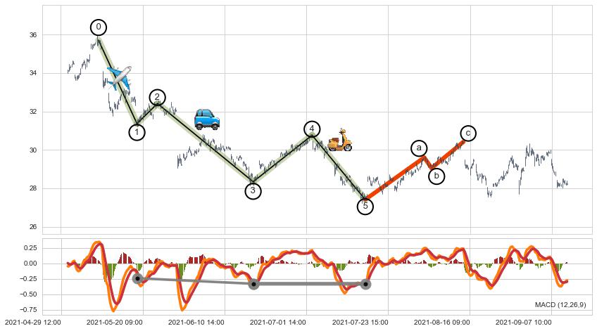 ➢ 波浪理论:猜想达到c点后小反弹终止反转下跌 → 下跌 → 【拐点】临近 → 阶段均值回复结束后继续大周期趋势跟踪