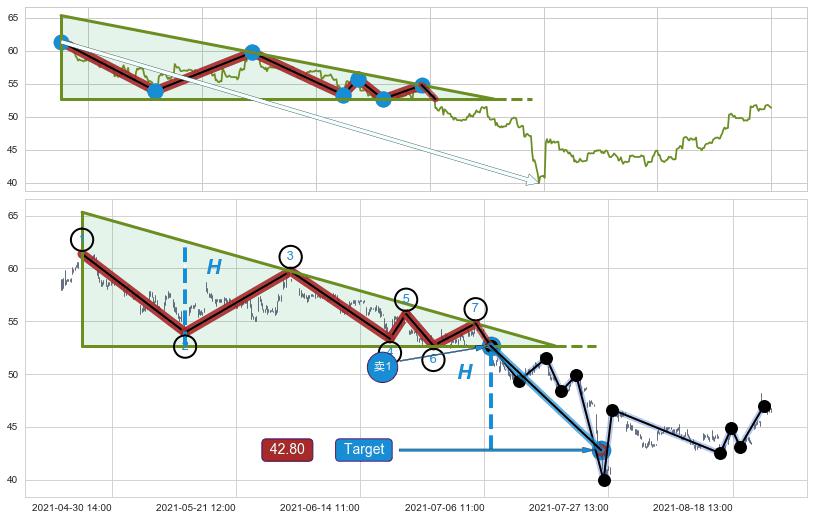 ➣ 最小中继整理跌幅→𝐇: 9.88 (下侧直角边第一支撑点②与斜边垂直距离)
