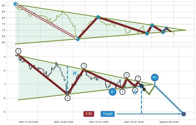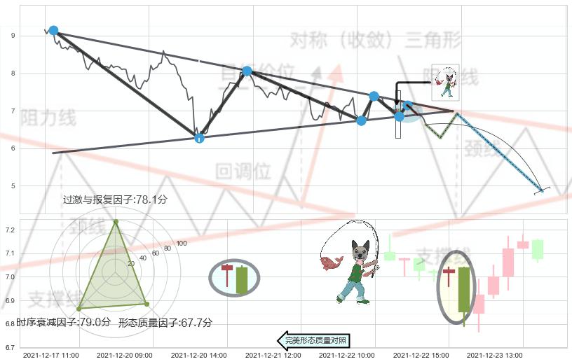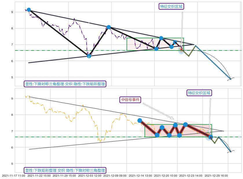 ➣ 【多空双方观望→争持→促使价格波动日益狭窄→空方打破攻守平衡点】对称三角形中继整理, 已在12-27:11突破【支撑】颈线 6.89 →演变成下降通道