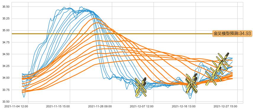 ➢ 120小时均线于(12-15 15:00: 33.94)形成【金叉】基于【金叉历史模型】预测金叉后最高波峰价格: 35.01, 金叉后最高价格34.47,尚未达到预测最高波峰价格, 预期继续上涨