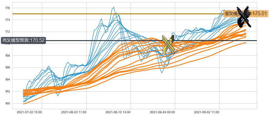 ➣ 75小时均线于(08-20 15:00: 169.60)形成【金叉】基于【金叉历史模型】预测金叉后最高波峰价格: 174.39, 金叉后最高价格176.01,已经上涨超出预测最高波峰价格, 预期回调