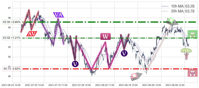 ♘ 阻力价格位63.92,可信任强度66.90%,距离最后交易2021-09-09 14:00形成的收盘价格63.16相差 +1.21%