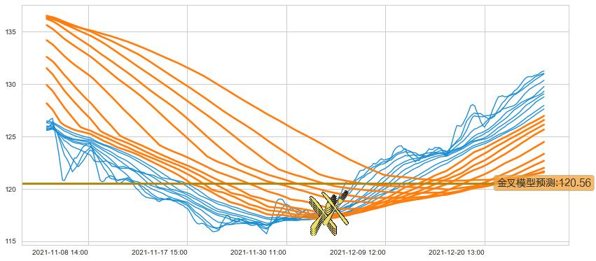 ➣ 90小时均线于(12-02 15:00: 117.49)形成【金叉】基于【金叉历史模型】预测金叉后最高波峰价格: 121.05, 金叉后最高价格131.64,已经上涨超出预测最高波峰价格, 预期回调