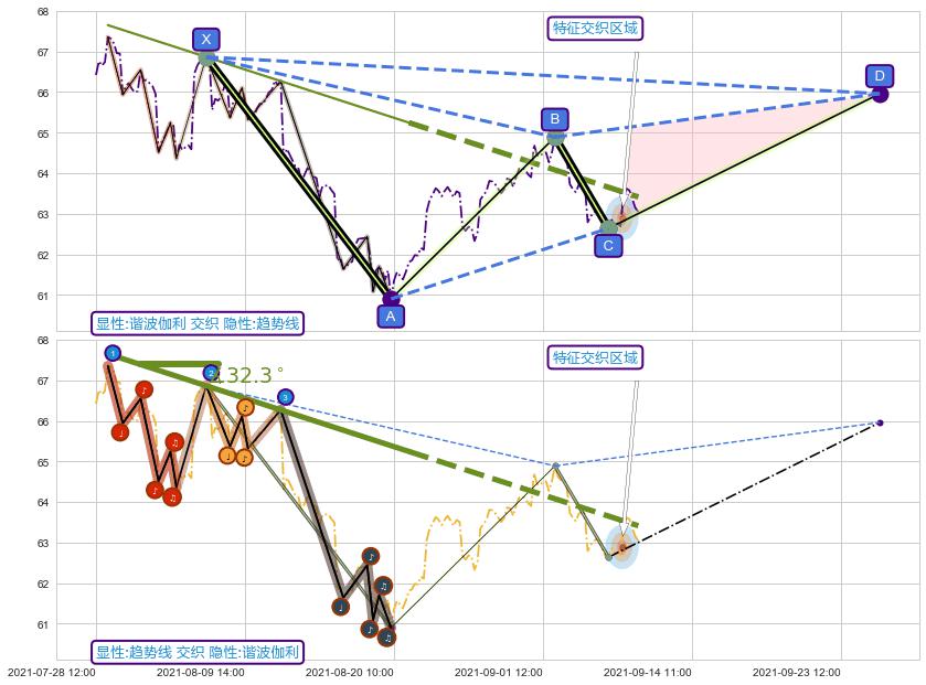 ➣ 2021-07-29 10:00-2021-08-23 09:00下跌趋势存在反转上涨[机会],虽然原下跌趋势的阻力位(63.41)已被突破,但其阻力效果尚存,原下跌趋势角度: 32.3˚