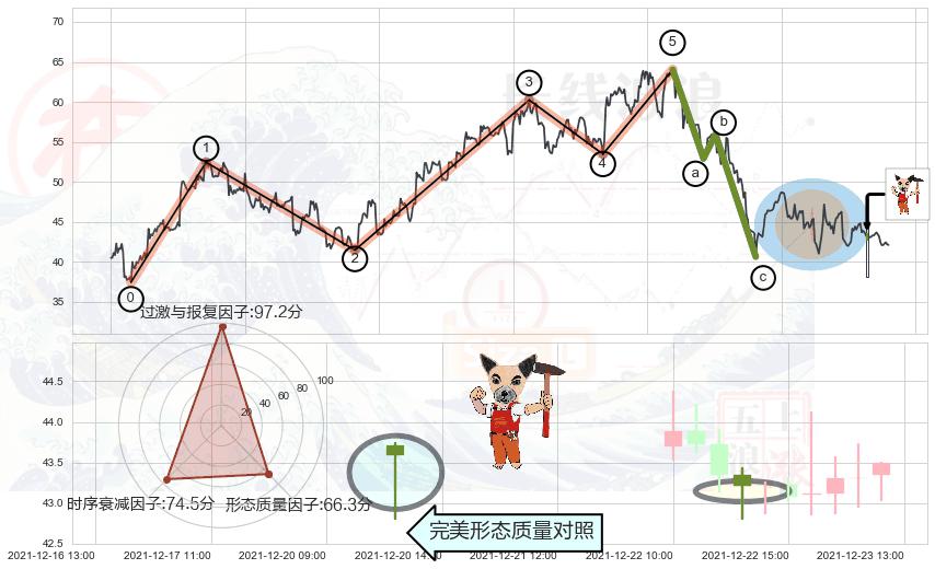 从2021-11-22 09:00至2021-12-06 09:00,共包含63个小时,阶段股价下跌-43.61%,阶段股价变动位移路程比: 1 : 2