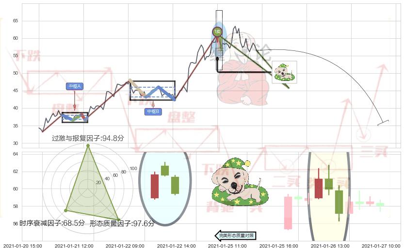 从2021-01-22 10:00至2021-01-25 13:00,共包含12个小时,阶段股价上涨6.69%,阶段股价变动位移路程比: 1 : 3