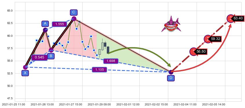 ➣ 未完成【鲨鱼】形态起点X: 01-25:11, 已到达C点: 01-27:12, 预测最终D点: 02-03:09, 共48交易小时