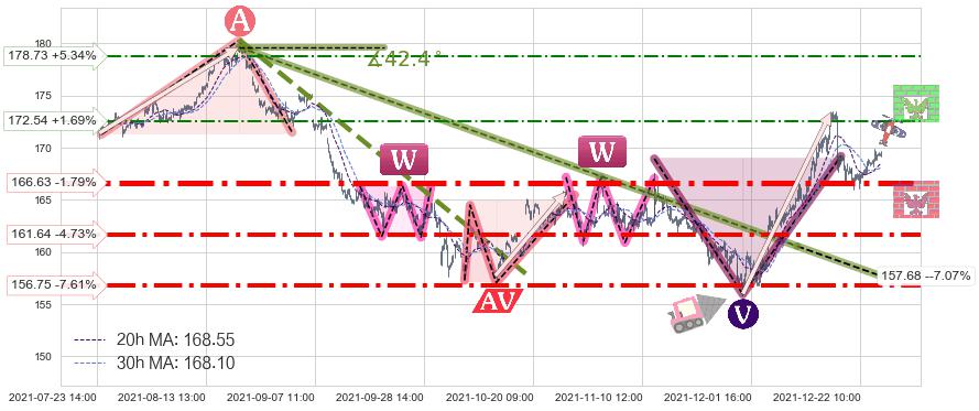 ♘ 阻力价格位172.54,可信任强度50.70%,距离最后交易2021-12-27 15:00形成的收盘价格169.67相差 +1.69%