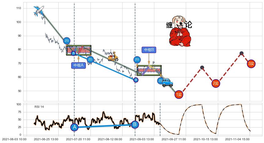 ➣ 缠论中枢点:下降缠中枢B破位后距离1买距离较远,随后猜想后续持续下跌(趋势跟踪)