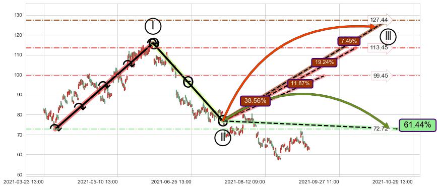 ➣ 调整浪已超过预测的c点位置,但后续大趋势循环浪高概率反转下跌,继续上涨概率38.56%,谨慎做多