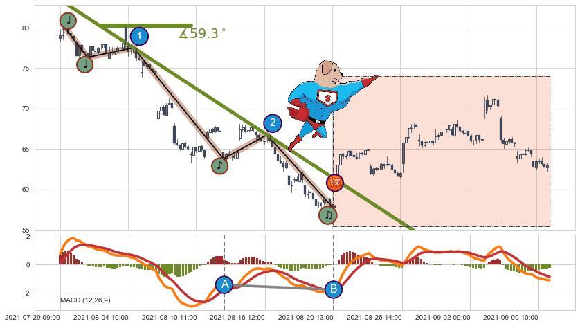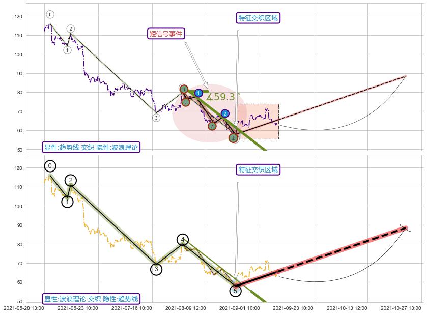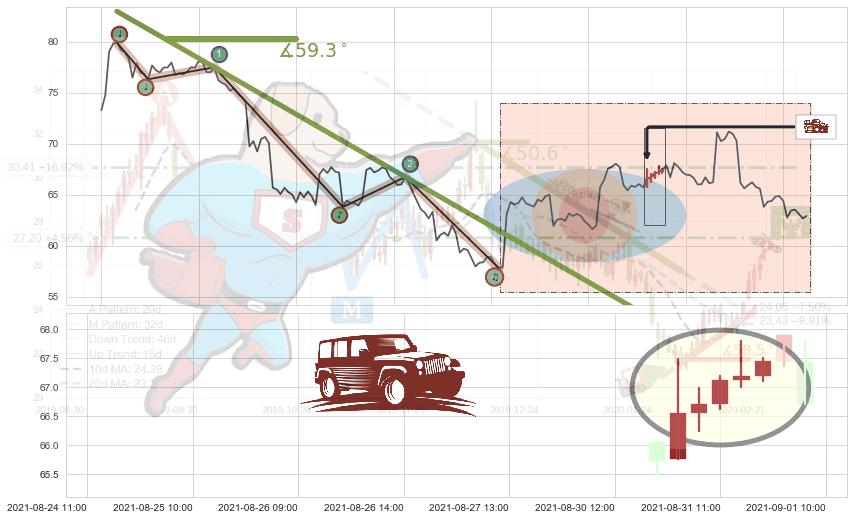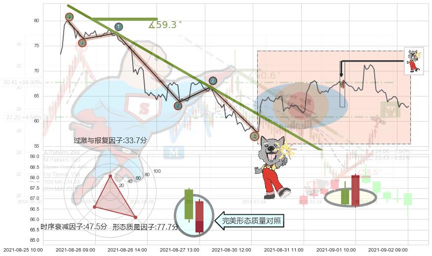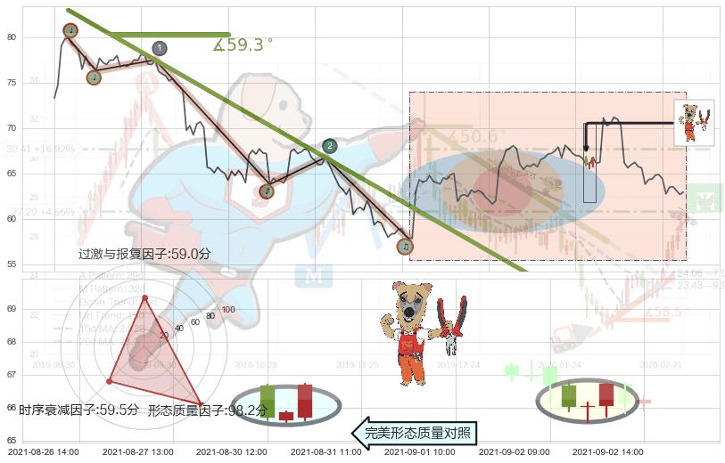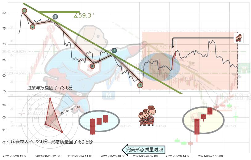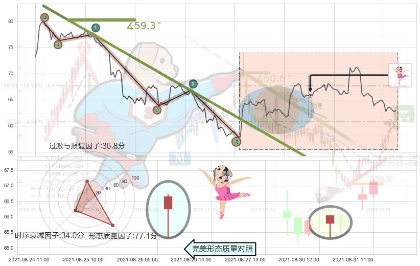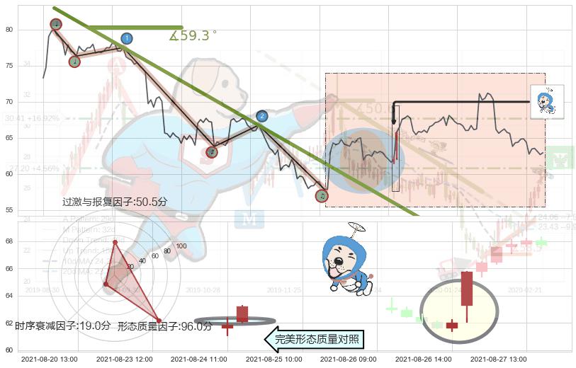 从2021-07-29 11:00至2021-08-27 12:00,共包含128个小时,阶段股价下跌-14.56%,阶段股价变动位移路程比: 1 : 9,下跌趋势角度: 59.3