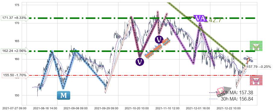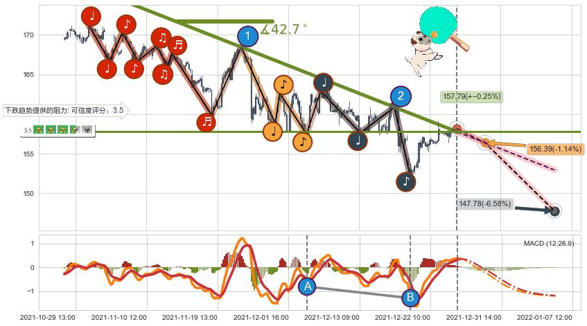 ➢ 预测:2021-12-30 11:00,【试探阻力】稳定目前下跌趋势的前提下,预测价格:156.39