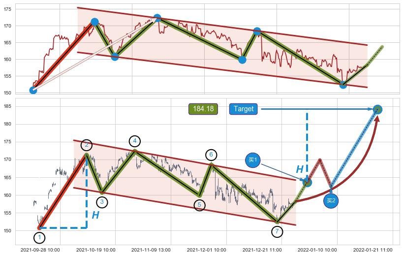➣ 最小中继整理涨幅→𝐇: 13.75 (上平行阻力线与下平行支撑线的垂直距离)