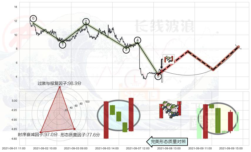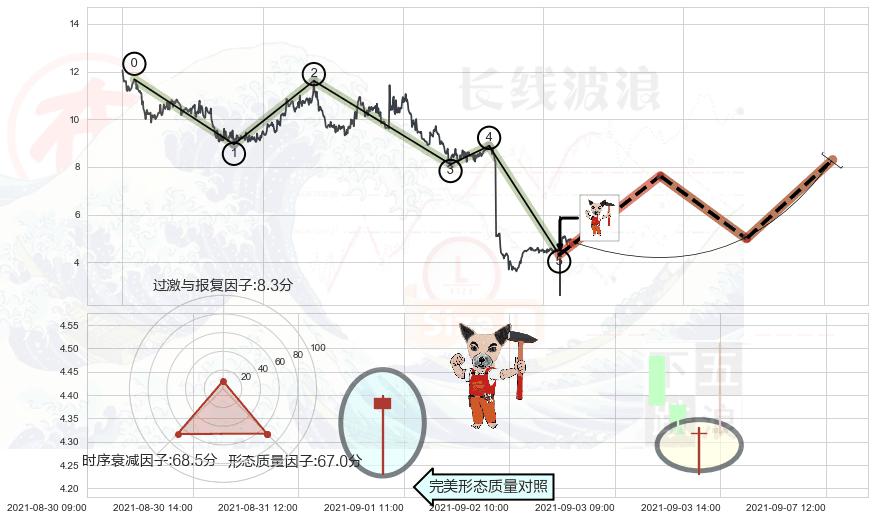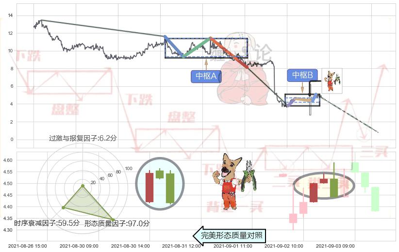 从2021-07-08 09:00至2021-09-09 15:00,共包含264个小时,阶段股价下跌-68.17%,阶段股价变动位移路程比: 1 : 6,2021-08-16 09:00向↘︎形成缺口,跳空下跌-38.22%˚