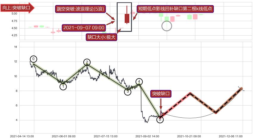➣ 突破缺口形成后,后续k已经超过14根,跳空突破波浪理论(5浪)关键点后, 出现【轻微回踩】迹象,短期低点影线回补缺口第二根k线低点