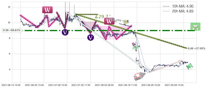 2021-06-18: 时域附近第一阻力位8.98持续的对下跌趋势进行阻拦,有效地放缓了下跌的速度。