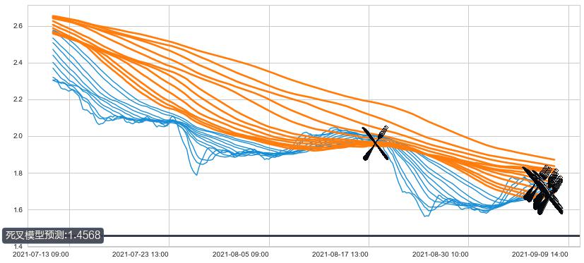 ➣ 110小时均线于(08-18 10:00: 1.9566)形成【死叉】基于【死叉历史模型】预测死叉后最低波谷价格: 1.6677, 死叉后最低价格1.5500,已经下跌超出预测最低波谷价格, 预期反弹