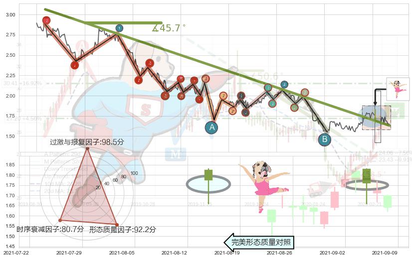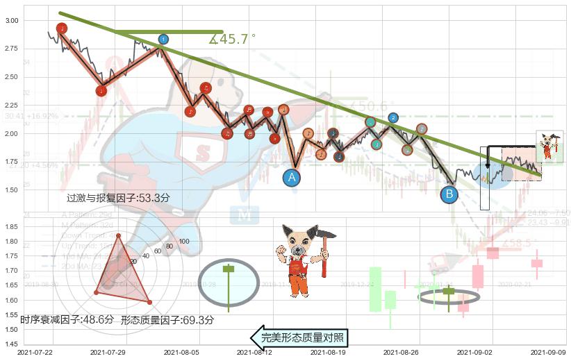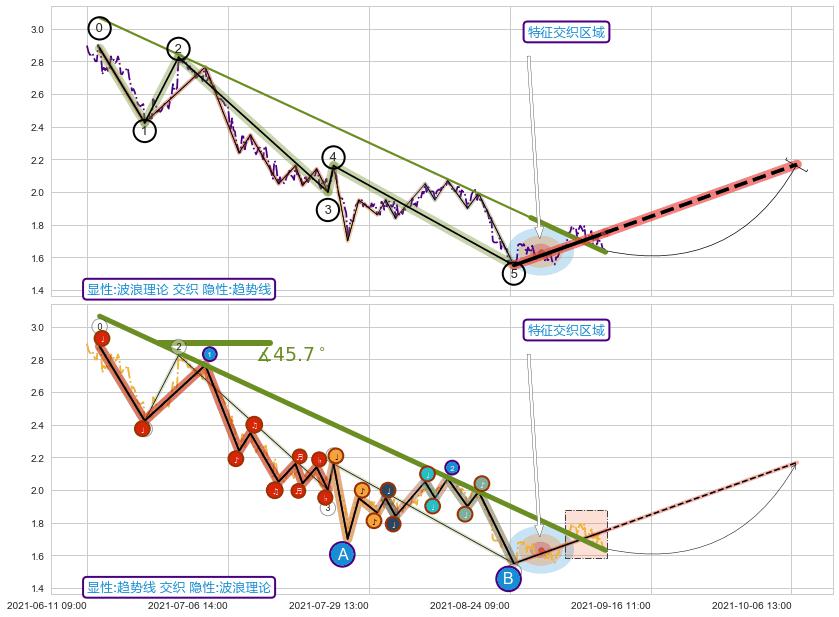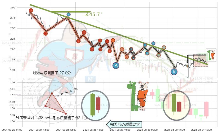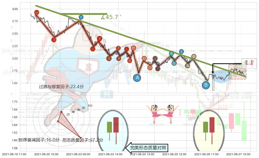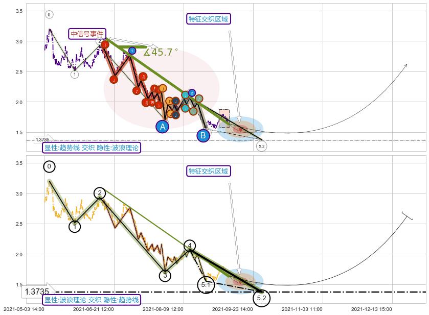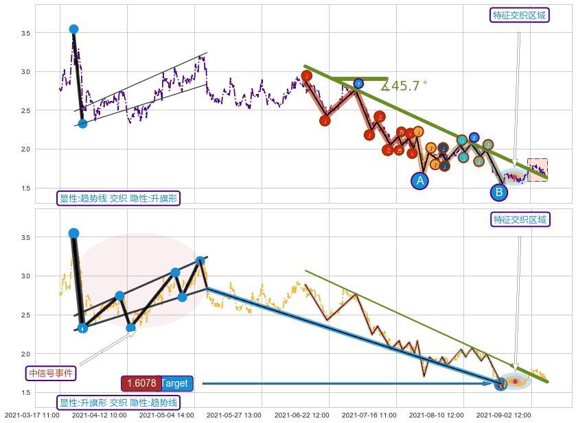 从2021-06-14 13:00至2021-08-26 12:00,共包含307个小时,阶段股价下跌-51.22%,阶段股价变动位移路程比: 1 : 8,下跌趋势角度: 45.7