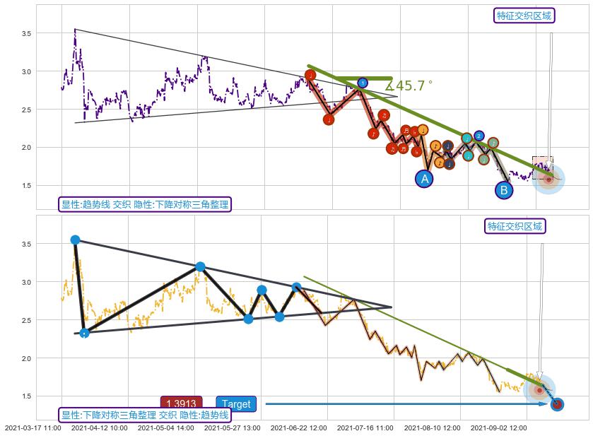 ➢ 最后的下跌趋势2021-06-14 13:00至2021-08-26 12:00:存在突破迹象,后续小反弹或者反转上涨