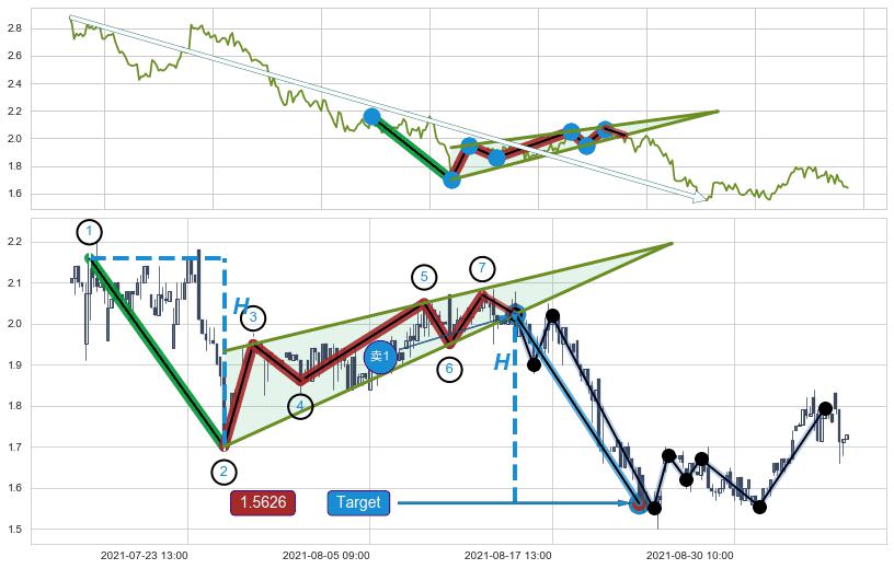 ➣ 升旗形:下跌target达成后 → 猜想下跌动能竭尽反转上涨 → 机会信号 → 大趋势均值回复