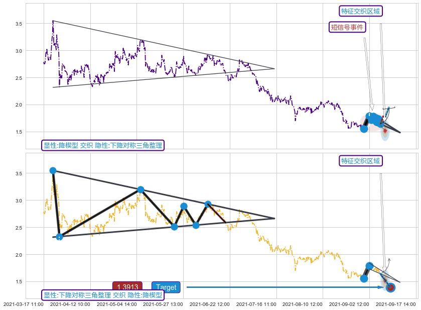 ➢ 降楔型属【短级别信号事件】下降对称三角整理属【长级别信号事件】长短周期组合信号事件, 短长事件长度比9.95%