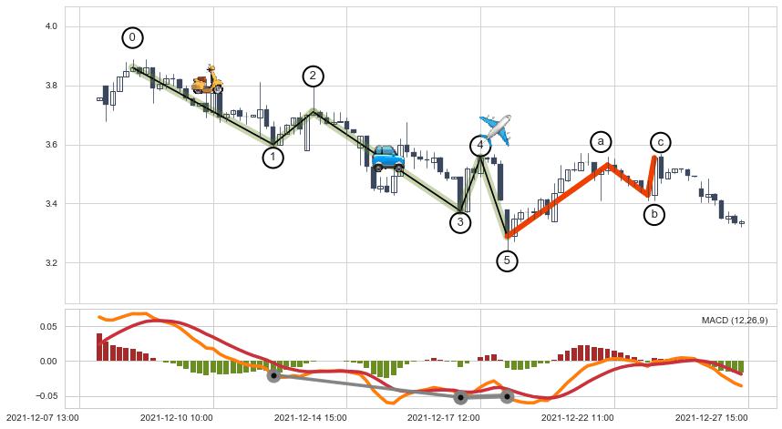 ➣ 波浪理论:猜想达到c点后小反弹终止反转下跌 → 下跌 → 【拐点】临近 → 阶段均值回复结束后继续大周期趋势跟踪