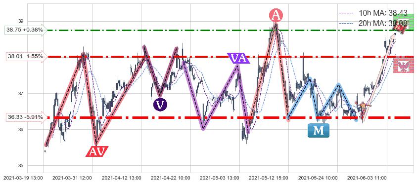 ♘ 支撑价格位38.01,可信任强度77.65%,距离最后交易2021-06-04 14:00形成的收盘价格38.61相差 -1.55%
