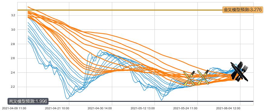 ➢ 34小时均线于(06-03 13:00: 2.443)形成【死叉】基于【死叉历史模型】预测死叉后最低波谷价格: 2.196, 死叉后最低价格2.360,尚未达到预测最低波谷价格, 预期继续下跌