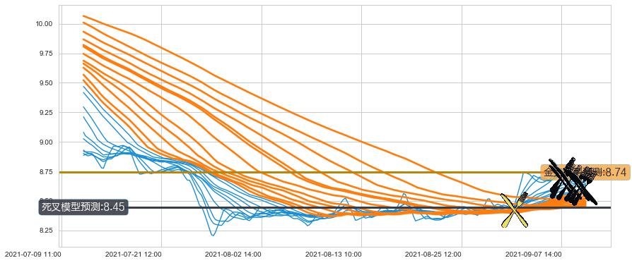 ➢ 13小时均线于(09-07 14:00: 8.72)形成【死叉】基于【死叉历史模型】预测死叉后最低波谷价格: 8.62, 死叉后最低价格8.60,虽然已经到达预测最低波谷价格,但耗时间很短动能很强, 预期继续下跌