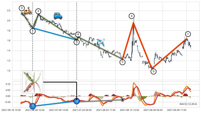 ➣ 波浪理论:猜想达到c点后小反弹终止反转下跌 → 下跌 → 【拐点】临近 → 阶段均值回复结束后继续大周期趋势跟踪